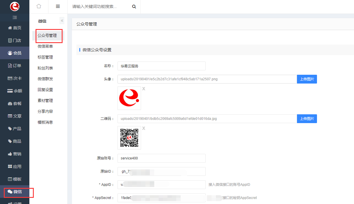 1.点击微信-公众号管理,开始绑定公众号,填写公众号名称、logo、二维码、原始账号(微信号)、原始id等配置