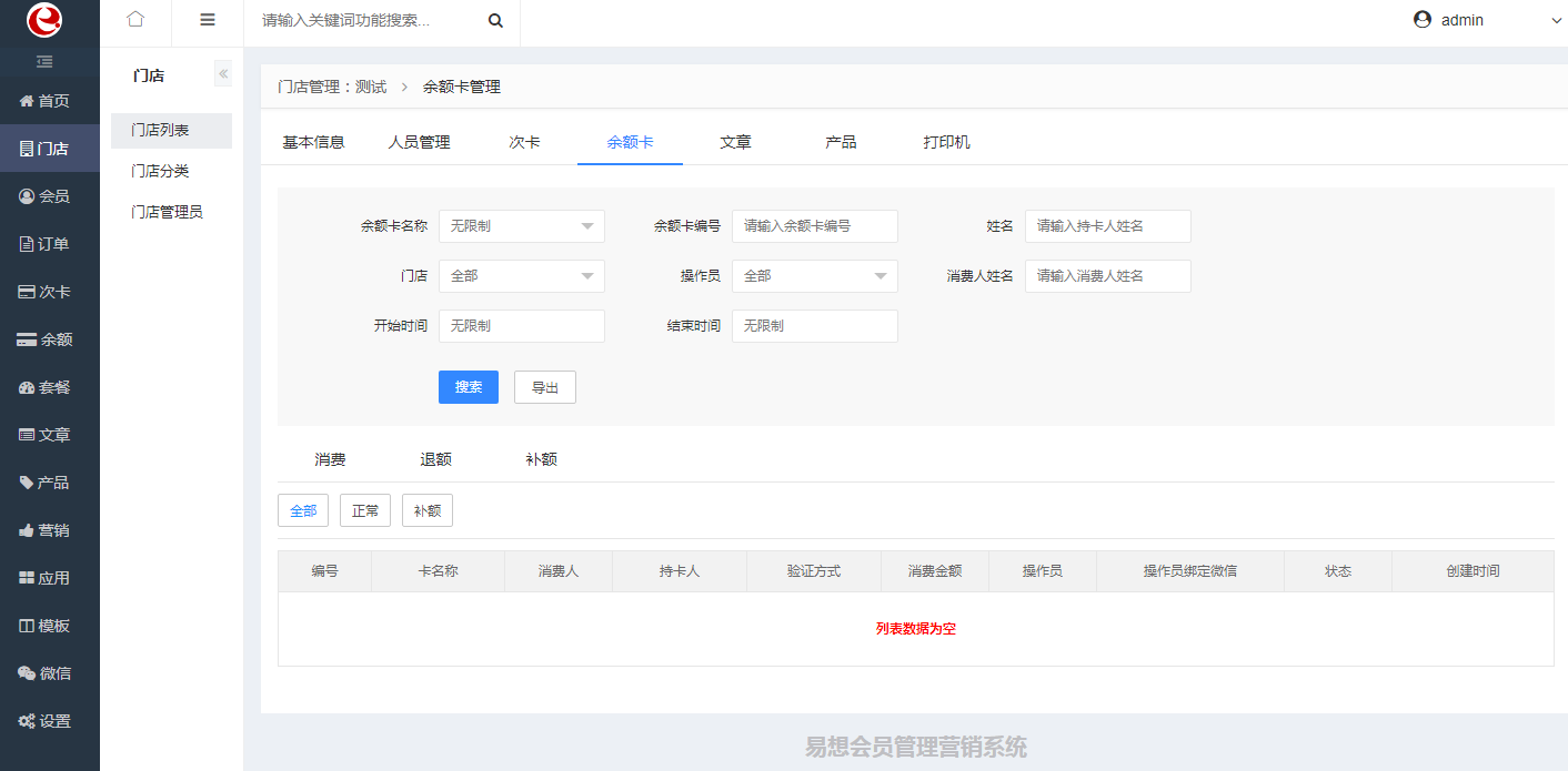 ●余额卡,显示此门店下的余额卡所有的记录,包括消费记录、退额记录、补额记录,可进行相关搜索查询